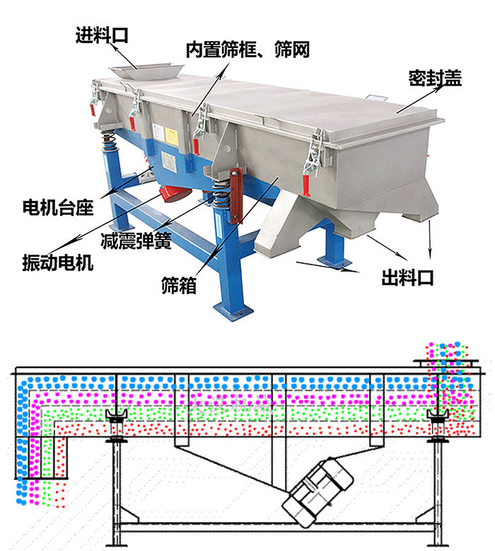 直線篩于直線振動篩是一樣的產(chǎn)品其結構可簡單分為:進料口、篩機蓋、篩板、出料口、彈簧和電機。