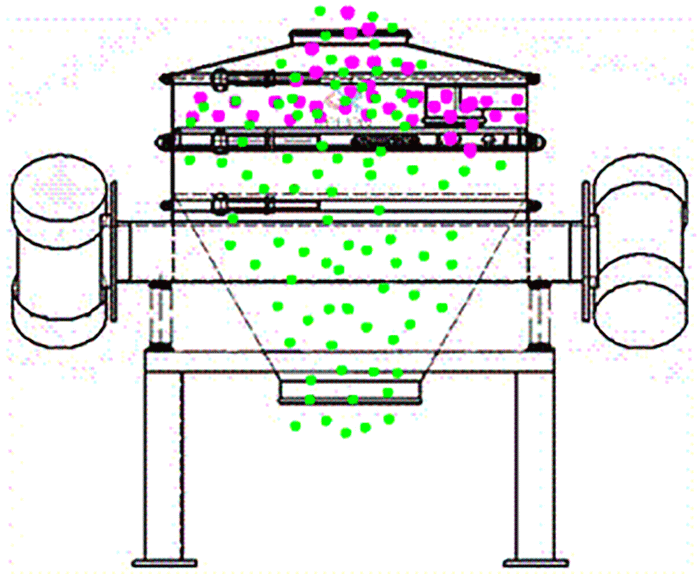 旋振篩是由電機提供振動源,從進料口投入物料,在振動狀態(tài)下穿過篩網(wǎng)直到出料口;防塵蓋、束環(huán)是為振動篩提供封閉狀態(tài)的。