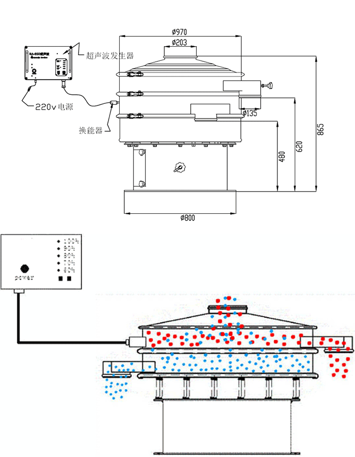 超聲波振動篩結構和旋振篩機構相同,只不過是在旋振篩的基礎上加裝了超聲波振動裝置。超聲波振動裝置可以使超聲波振動篩的篩分效率高出很多。