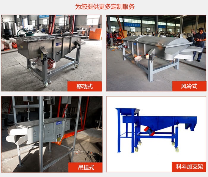 直線篩選機可根據(jù)要求采用不同的設(shè)計,如篩機的總高度、進(jìn)料口角度/尺寸、出料口角度/尺寸/加閥、設(shè)備表面處理可選擇拋光或噴砂、普通電機/防爆電機等。不同設(shè)計,價格不同。