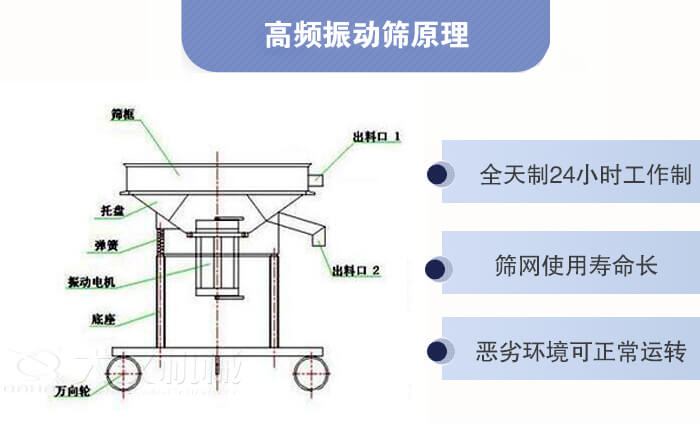 高頻振動篩又稱高頻過濾篩,結構簡單、體積小、具有高頻率,低耗能的特點,頻率每分鐘可達3000次,比相同機型的篩分過濾設備耗能減少一半,與物料接觸部分皆可采用不銹鋼304或者316L材質。