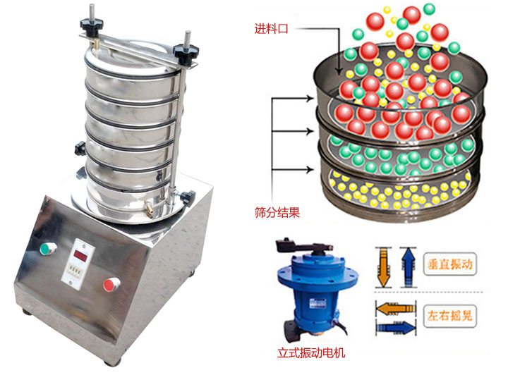 準(zhǔn)試驗(yàn)篩是以YZU立式振動(dòng)電機(jī)作為整機(jī)振動(dòng)源,通過振動(dòng)電機(jī)帶動(dòng)上部振動(dòng)盤振動(dòng),再通過振動(dòng)盤傳導(dǎo)至安放在振動(dòng)盤上部Φ200篩框上,然后由需要檢測目數(shù)的篩框把小于篩面網(wǎng)孔的物料顆粒篩分至下層篩框,如此層層篩選,使每層試驗(yàn)篩內(nèi)只留相同粒度的物料,達(dá)到不同粒度的分離并確定此物料的粒度組成,使Φ200型篩框中的物料能非常有效的起到過濾、分級(jí)、篩分目的。