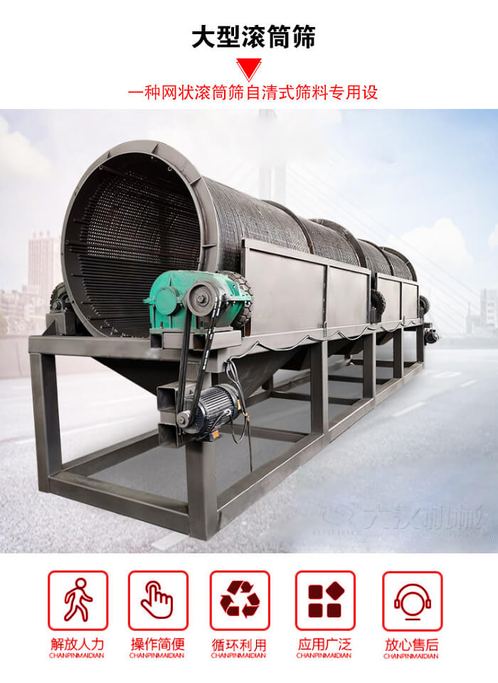 大型滾筒篩,因其獨特的結構特點,完全有效地解決了其他型式篩分設備所存在的缺點,是綜合利用電站的篩型。是繼國內各大公司生產(chǎn)的普通型網(wǎng)狀滾筒篩之后的自清式篩料專用設備。